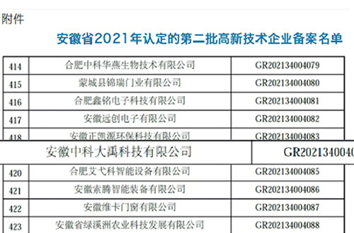 • 入選安徽省2021年第一批入庫科技型中小企業
